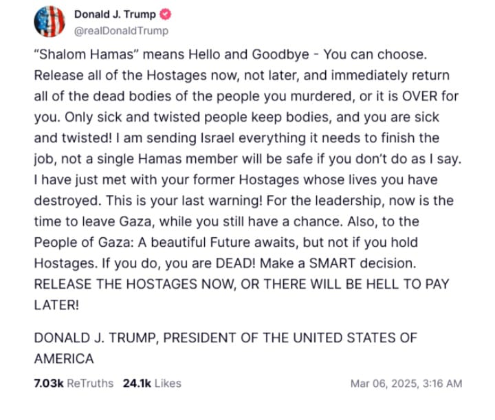 സമൂഹമാധ്യമമായ ട്രൂത്ത് സോഷ്യലിലായിരുന്നു ട്രംപിന്റെ ഭീഷണി. ‘ശാലോം ഹമാസ്’ എന്നാൽ ഹലോ ആൻഡ് ഗുഡ്ബൈ എന്നാണ് അർത്ഥമാക്കുന്നത് – നിങ്ങൾക്ക് തിരഞ്ഞെടുക്കാം. എല്ലാ ബന്ദികളെയും ഇപ്പോൾ വിട്ടയയ്ക്കുക, പിന്നീട് അല്ല. നിങ്ങൾ കൊലപ്പെടുത്തിയ ആളുകളുടെ എല്ലാ മൃതദേഹങ്ങളും ഉടൻ തിരികെ നൽകുക. അല്ലെങ്കിൽ നിങ്ങൾ അവസാനിച്ചു’, ട്രംപ് കുറിച്ചു. ബന്ദികളെ മോചിപ്പിക്കാത്ത പക്ഷം ഹമാസിനെ അവസാനിപ്പിക്കാന് വേണ്ട എല്ലാ സഹായങ്ങളും ഇസ്രയേലിനു നല്കുമെന്നും യുഎസ് പ്രസിഡന്റ് അറിയിച്ചു.