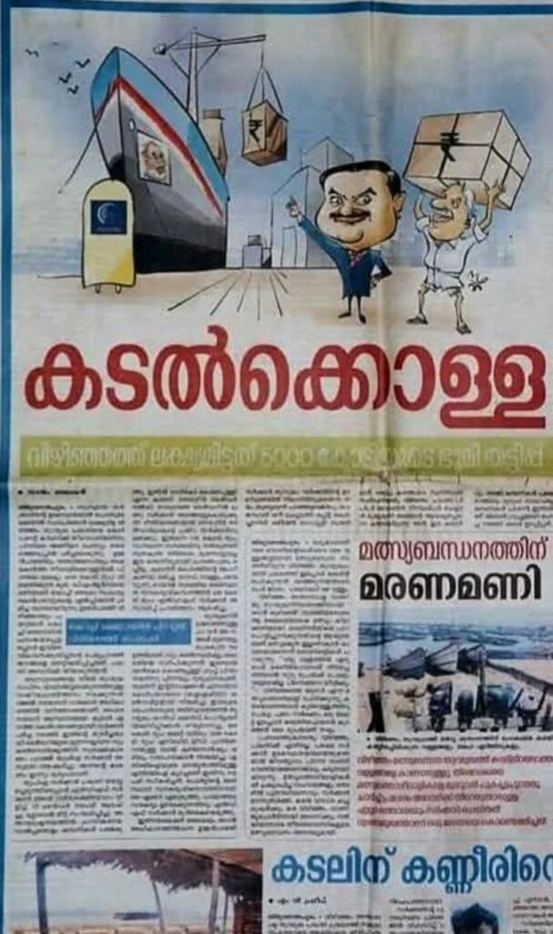 അന്നാകട്ടെ സിപിഎമ്മിന്റെ മുഖപത്രമായ ദേശാഭിമാനി ‘കടൽക്കൊള്ള’ എന്ന തലക്കെട്ടിലാണ് അച്ചുനിരത്തി പ്രതിരോധിച്ചത്. വിഴിഞ്ഞത്ത് ലക്ഷ്യമിടുന്നത് 5,000 കോടിയുടെ ഭൂമി തട്ടിപ്പാണെന്നും എഴുതിപ്പിടിപ്പിച്ചു.