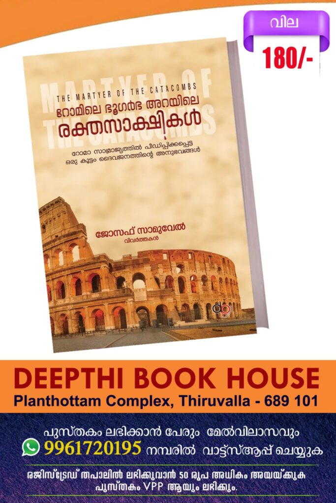 കോട്ടയം :യേശുക്രിസ്തുവിനുവേണ്ടി രക്തസാക്ഷിത്വം വഹിച്ച ധീരന്മാർ സഭയുടെ രാജകുമാരന്മാരാണെന്ന് തോമസ് എബ്രഹാം. ദീപ്തി പബ്ലിക്കേഷൻസ് പ്രസിദ്ധീകരിച്ച ‘ഭൂഗർഭ അറകളിലെ രക്തസാക്ഷികൾ’എന്ന ഗ്രന്ഥം പ്രകാശനം ചെയ്തുകൊണ്ട് പ്രസംഗിക്കുകയായിരുന്നു അദ്ദേഹം.